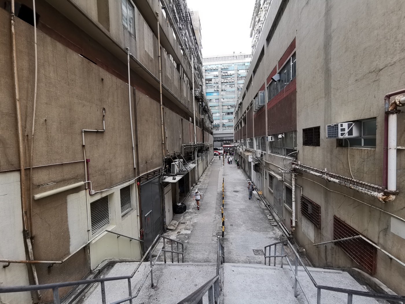以上示範可能表達不夠好,不如到室外測試,先來試試 mate 20 Pro 的 16mm ( 107度 ) 最廣闊視覺效果,下圖所見是來自 print screen 而不是成像圖,所以可見到整個操作介面,而這個畫面,也就是等於拍攝前,屏幕所見實時影像,留意圖中右手邊的橫巷,兩部冷氣機下面光線比較暗,另外圖中最右下角的轉角處是一片黑色,另外圖中左手邊車路慢線位置,其路面因為處於天僑底,路面比較暗。