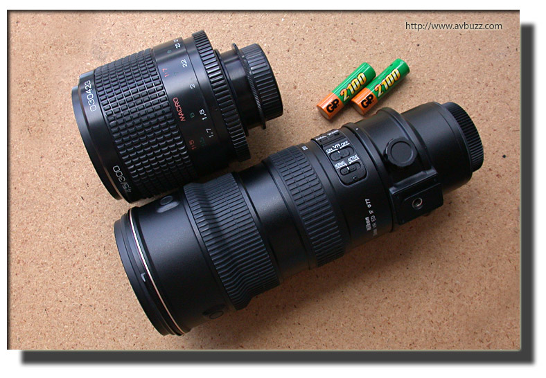 圖中上面的為蘇聯的平價 300MM反射鏡頭,下為一枝 70- 200MM的長距離鏡頭,