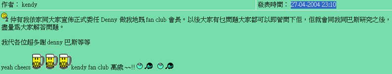 ¥H¤U¬OKendy¦b¯d¨¥ª©¤º¡A©Ò¤j®a«Å§G©e¥ôDenny¦¨¬°Fan Club·|ªøªºì¤å¡C