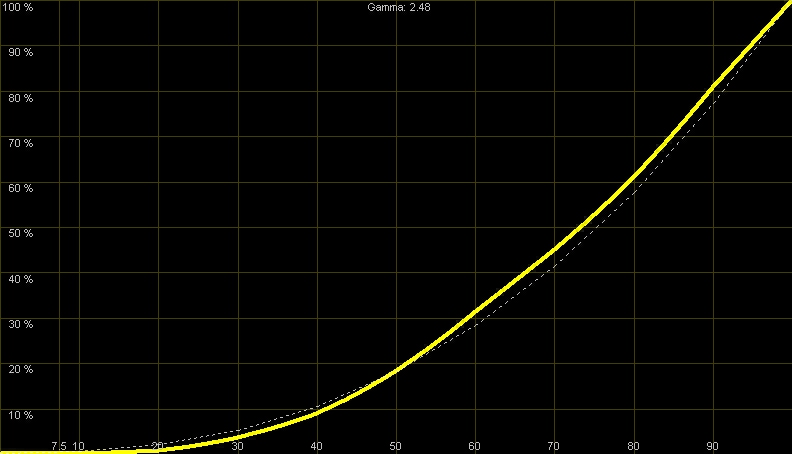 這是經6500K色溫調校後的伽碼值是2.48,只是少許偏離2.2虛線的標準,並沒有造成混亂。