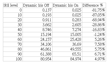 為了了解動態光圈的實際運作,我再量度十級由0至100IRE的亮度在動態光圈On