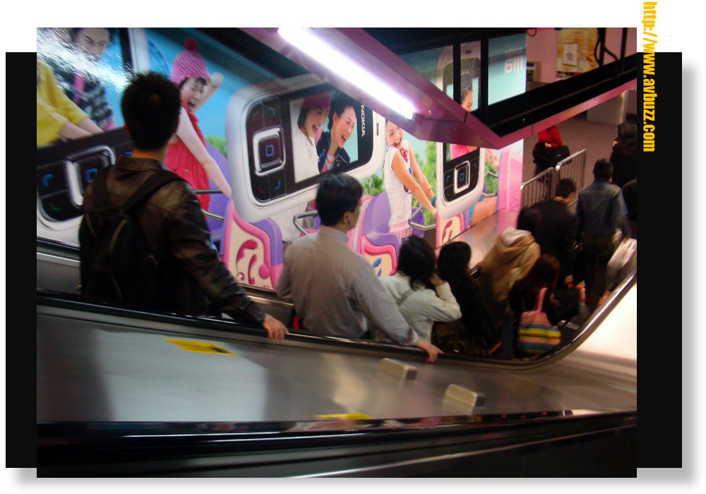 圖中整條扶手電梯左右兩邊,都是都是這個廣告,日似過山車的意念表達。