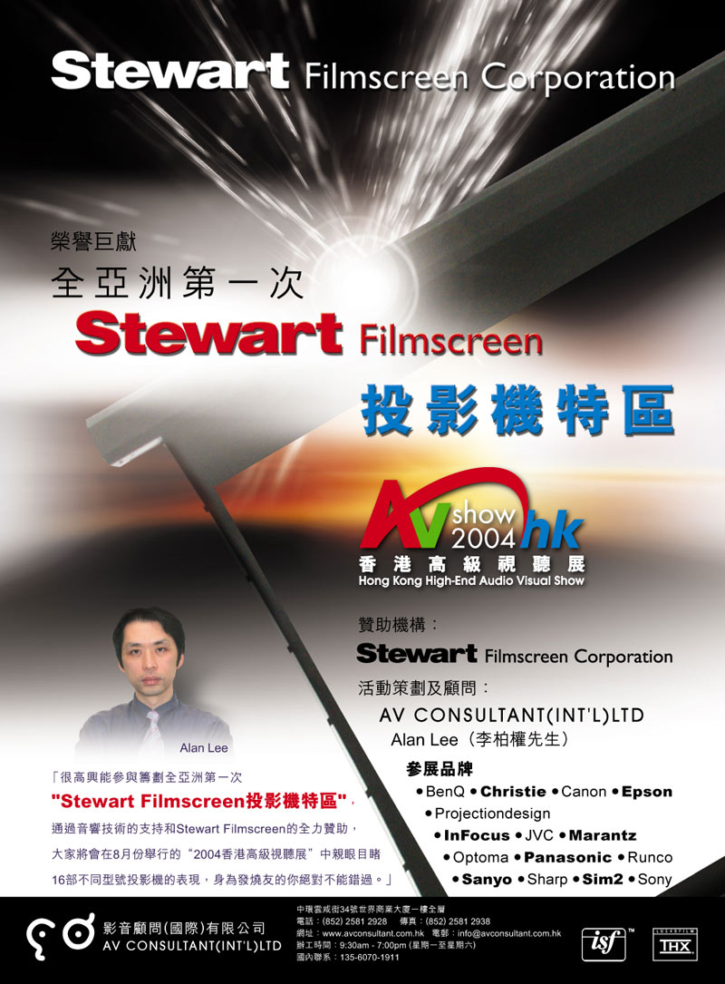 16個參展商,必需只能使用Stewart投影幕,四款型號和質料的呎吋幕可選擇。